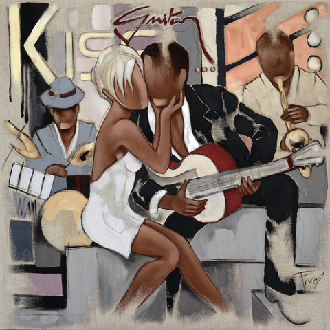 Pierre Farel, baiser d’un coupleen soirée musicale. Femme sexy et homme à la guitare